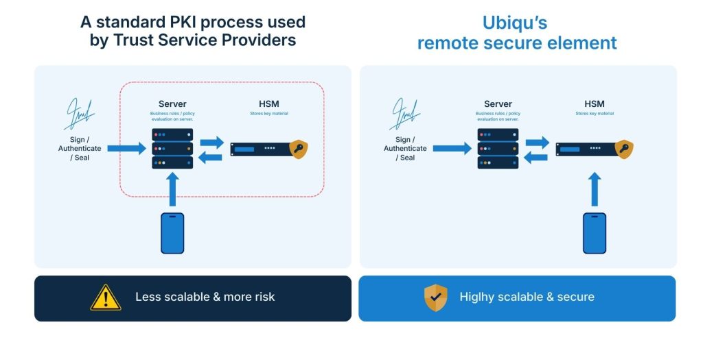 Ubiqu enforces keys and policies together inside the HSM, while keeping orchestration outside the secure boundary, reducing complexity and eliminating the need for external policy servers. Trust services scale by adding HSM capacity, not surrounding infrastructure, giving organisations a simpler backend that can evolve over time.
